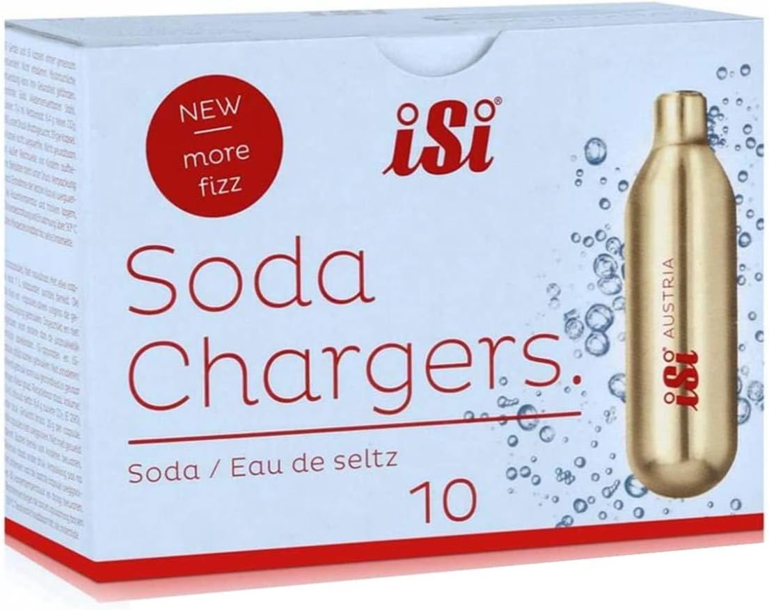 Transform your beverage experience with iSi NA North America CO2 Soda Siphon Chargers. Designed to deliver precision and consistency, these 8.4g gold cartridges are the perfect addition to your iSi Classic SodaMaker or iSi Stainless Steel Soda Siphon. Each charger is crafted from recycled steel and is fully recyclable, making it a responsible choice for carbonating enthusiasts. Enjoy the art of carbonation with chargers that are electronically weighed and sealed to ensure uniform performance. Whether you're crafting sparkling water, refreshing juice spritzers, handcrafted cocktails, or even carbonating wine, these chargers provide the ideal fizz every time. With a capacity to carbonate up to 1 quart of liquid per cartridge, they offer reliable functionality for a variety of beverages. Using the chargers is straightforward. Simply insert one into an iSi Charger Holder, screw it onto the siphon to release the CO2, and shake. In moments, you'll have a glass of refreshing, freshly carbonated drinks ready to enjoy. The included batch numbers on each charger ensure quality control and traceability, enhancing your confidence in the product. Proudly produced in Austria, these chargers reflect a blend of innovation and attention to detail. Their compatibility with iSi soda siphons and thoughtful design make them an excellent choice for home carbonation enthusiasts and mixologists alike. Bring the refreshing fizz of sparkling beverages into your kitchen with iSi soda chargers. DISCLAIMER: By ordering iSi chargers, you confirm you are at least 18 or meet the legal age requirement and will not misuse the product or supply it to minors. If purchasing for a third party, you agree to inform them of applicable terms. You must comply with all relevant laws. Neither the marketplace nor the seller assumes liability for product use.